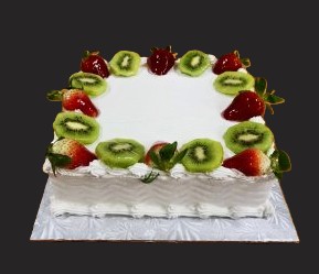 Three layers of vanilla sponge. One layer of vanilla custard and fresh kiwis, and one layer of vanilla custard and fresh strawberries. Finished with non-dairy whipped cream, and topped with slices of strawberry and kiwi.
